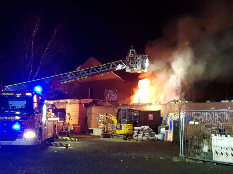 Zweimal hat es in den vergangenen Jahren in der ehemaligen Raststätte Cloppenburger Land gebrannt. In der Nacht auf Samstag brannte es dann zum dritten Mal. Jetzt war es die Kegelbahn. Als wir gegen 00:45 eintrafen schlugen Flammen aus dem vorgebauten Gastraum. An einen Löscheinsatz im Inneren des Gebäudes war nicht denken. Zu groß wäre die Gefahr für unsere Atemschutztrupps gewesen. Also löschten wir von außen mit dem Strahlrohr und über den Wasserwerfer der Drehleiter. Das Flachdach der Kegelbahn stellte ein Problem dar. Wir schufen uns zunächst eine Öffnung im Mauerwerk um auch in der Bahn löschen zu können. Dabei kamen eher selten genutzte Werkzeuge wie der benzingetriebene Trennschneider zum Einsatz. Später stand uns ein Bagger zur Verfügung. Zunächst von einem technischen Betrieb in der Nachbarschaft, dann vom städtischen Bauhof. Als das Dach entfernt war, flammte es noch einmal gut auf, das bekamen wir aber schnell in den Griff.