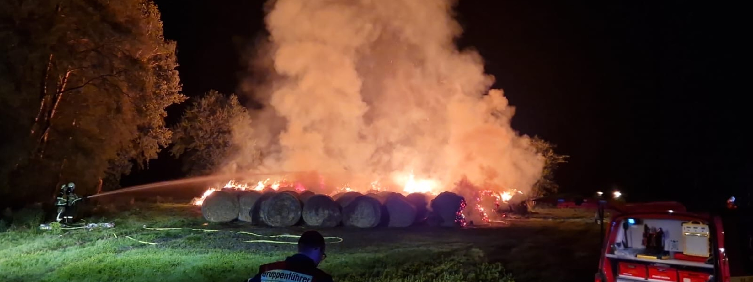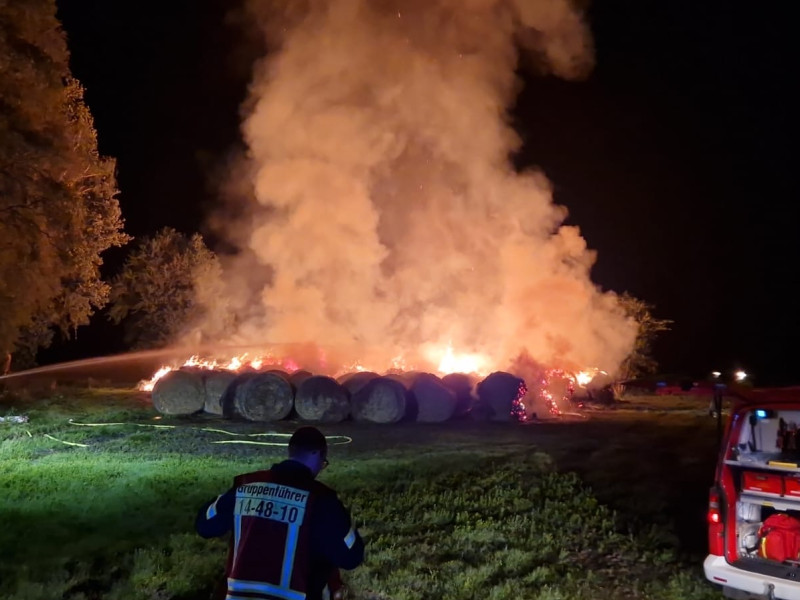 In der Nacht zu Freitag, 24. Mai 2024, 01:20 Uhr, bemerkte ein Zeuge, auf einem Feld am Wellensdamm, in der Nähe des Plaggenwegs, dass mehrere Strohballen in Brand stehen. Er alarmierte daraufhin den Notruf. Die Freiwillige Feuerwehr Cloppenburg rückte sodann mit mehreren Fahrzeugen und rund 30 Einsatzkräften zum Brandort aus und konnte die Rundballen löschen und das Übergreifen der Flammen auf angrenzende Bäume verhindern. Dennoch wurden ca. 100 Ballen vollständig zerstört, der Schaden beläuft sich auf rund 2500 Euro. Da die genaue Brandursache vor Ort nicht festgestellt werden konnte, wurde der Brandort von der Polizei beschlagnahmt, die Ermittlungen zur Brandursache werden heute weitergeführt. Zeugen, die Hinweise zum Brand geben können, werden gebeten, sich mit der Polizei in Cloppenburg, Tel. 04471-18600 in Verbindung zu setzen.