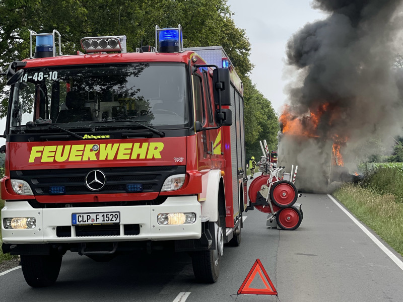 Am Freitagmittag kam es auf der Molberger Straße zu einem Brand eines Getränkewagens. Beim Eintreffen der ersten Einsatzkräfte stand dieser bereits in Vollbrand und die beiden mitgeführten Kohlensäureflaschen haben durch die thermische Belastung abgeblasen.