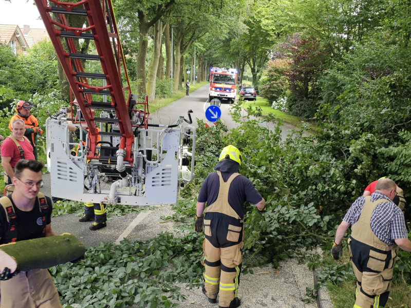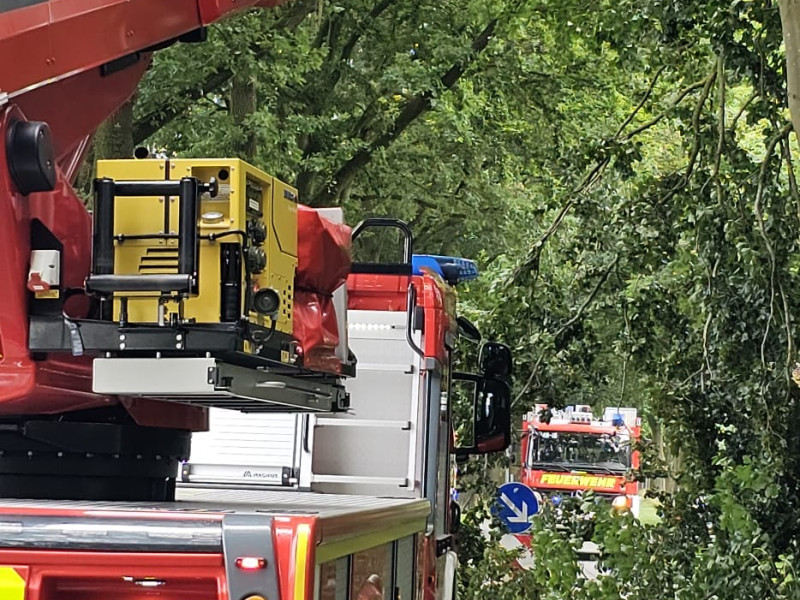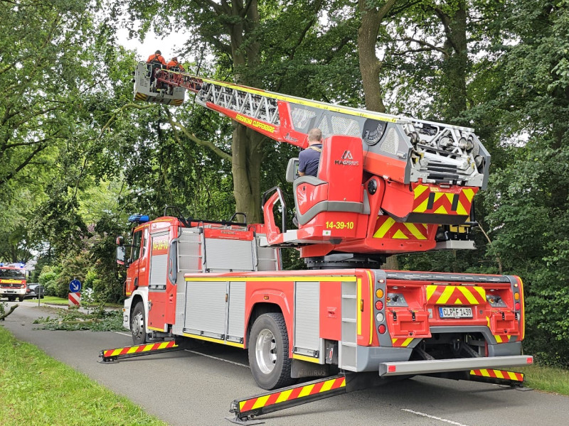 Okay, heute ist Tag der technischen Hilfeleistung. Einsatz Nummer 2 ist ein aus der Baumkrone herausgebrochener großer Ast auf der fahrenden Straße. Nach kurzer Diskussion, wie man es am besten macht, ob man ihn rauszieht oder ob wir ihn noch mit der Drehleiter und Motorsäge herausschneiden, haben wir uns für Variante 2 entschieden. Das hat auch ganz gut funktioniert. Nach ungefähr einer Dreiviertelstunde war die Sache erledigt. Der erste Einsatz heute Morgen, das war eine kleine technische Hilfeleistung, ein Kind eingeschlossen im Auto. Alles ist glücklich ausgegangen und wir hoffen, dass dieser Baum jetzt der letzte Einsatz für heute war.