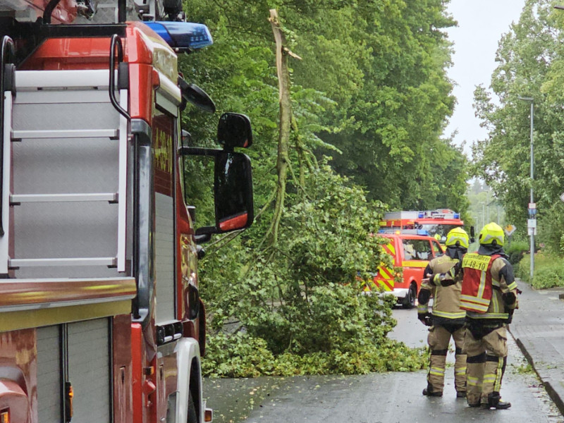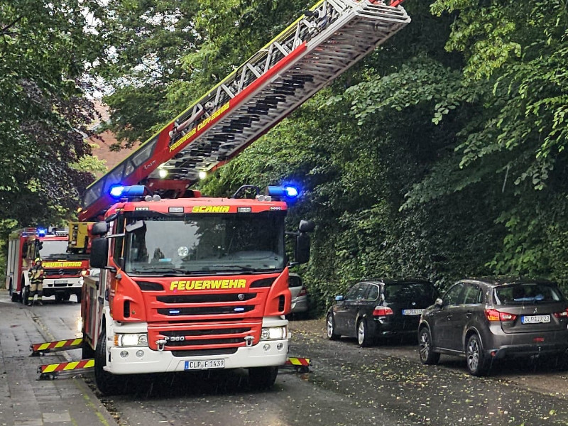 Wir zerlegten das Bruchstück in handhabbare Teile und lagerten diese gesichert am Straßenrand. Anschließend wurde die Drehleiter in Stellung gebracht, um den betroffenen Baum weiter auf mögliche Gefahrenstellen zu prüfen. Lose Reste in der Krone wurden entfernt, um eine Gefährdung für den Straßenverkehr auszuschließen.