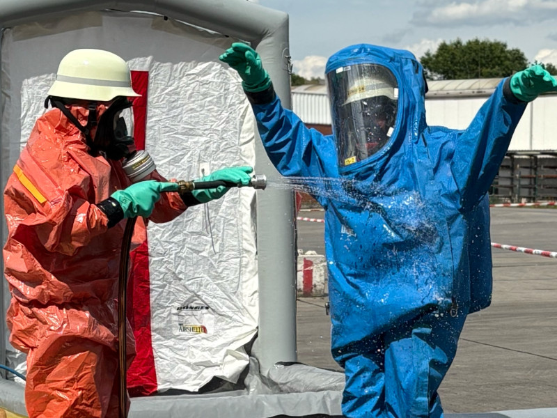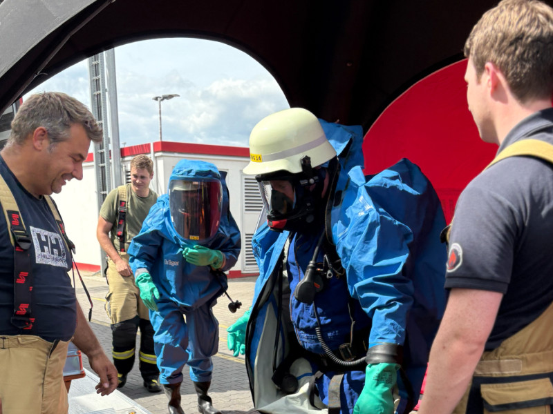 Nach Abschluss der Arbeiten mussten die eingesetzten Angriffstrupps die Dekontaminationsstrecke durchlaufen und gründlich gereinigt werden. Die Feuerwehr Cloppenburg stellte insgesamt zwei Trupps, die unter schwierigen Bedingungen im Einsatz waren.
