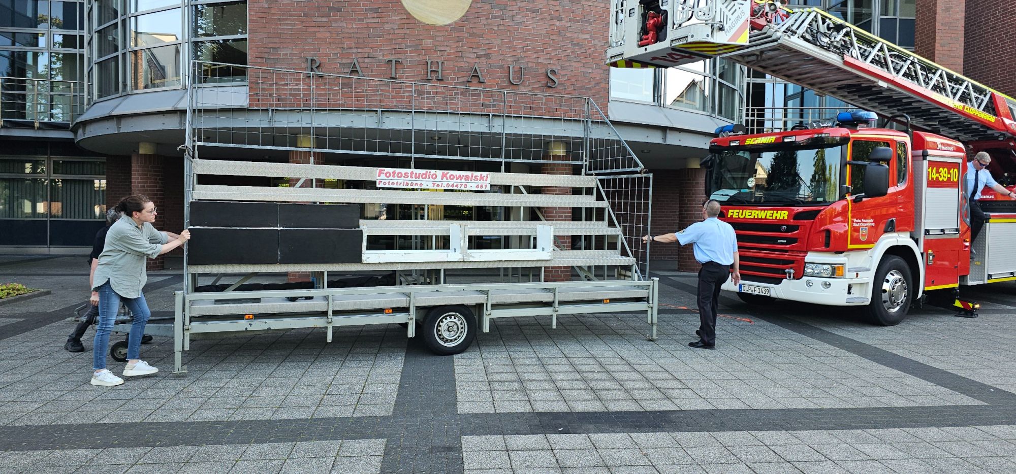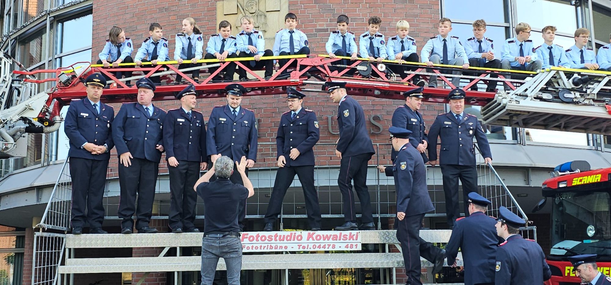 Und dann noch Brust raus, Bauch rein, Oberkörper nach links oder nach rechts, je nachdem. Du noch ein bisschen nach links… Die Jugend auf die Leiter, die Altersriege sitzt ganz vorne und dann bitte das Lächeln nicht vergessen. Ja, ihr ahnt es schon, heute war unser großer Fototermin. Weit über 100 Männer und Frauen, Jungs und Mädchen mussten mit aufs Bild. Die Drehleiter war natürlich auch dabei und unser LF10 ebenso. Perfekt in Position und ins Bild gesetzt wurden wir vom Fotostudio Kowalski. Das klappte alles ganz wunderbar.