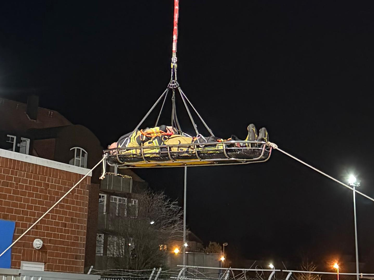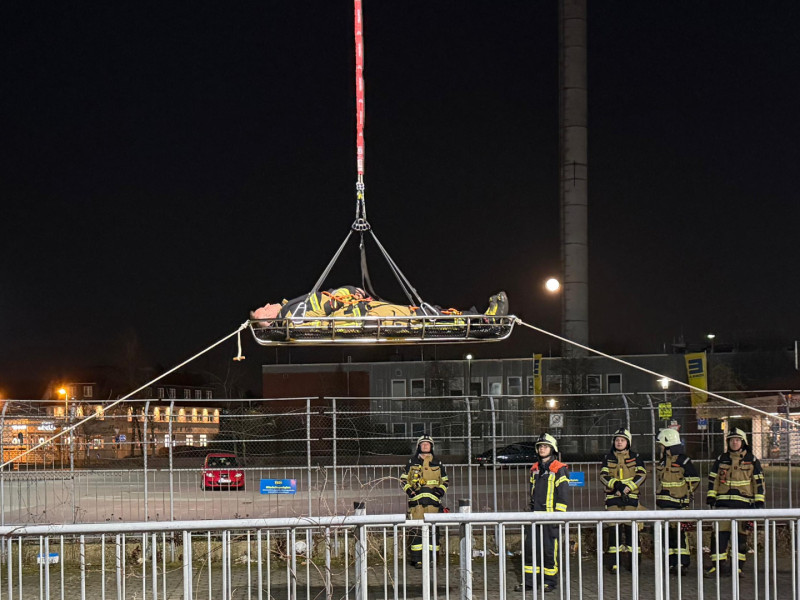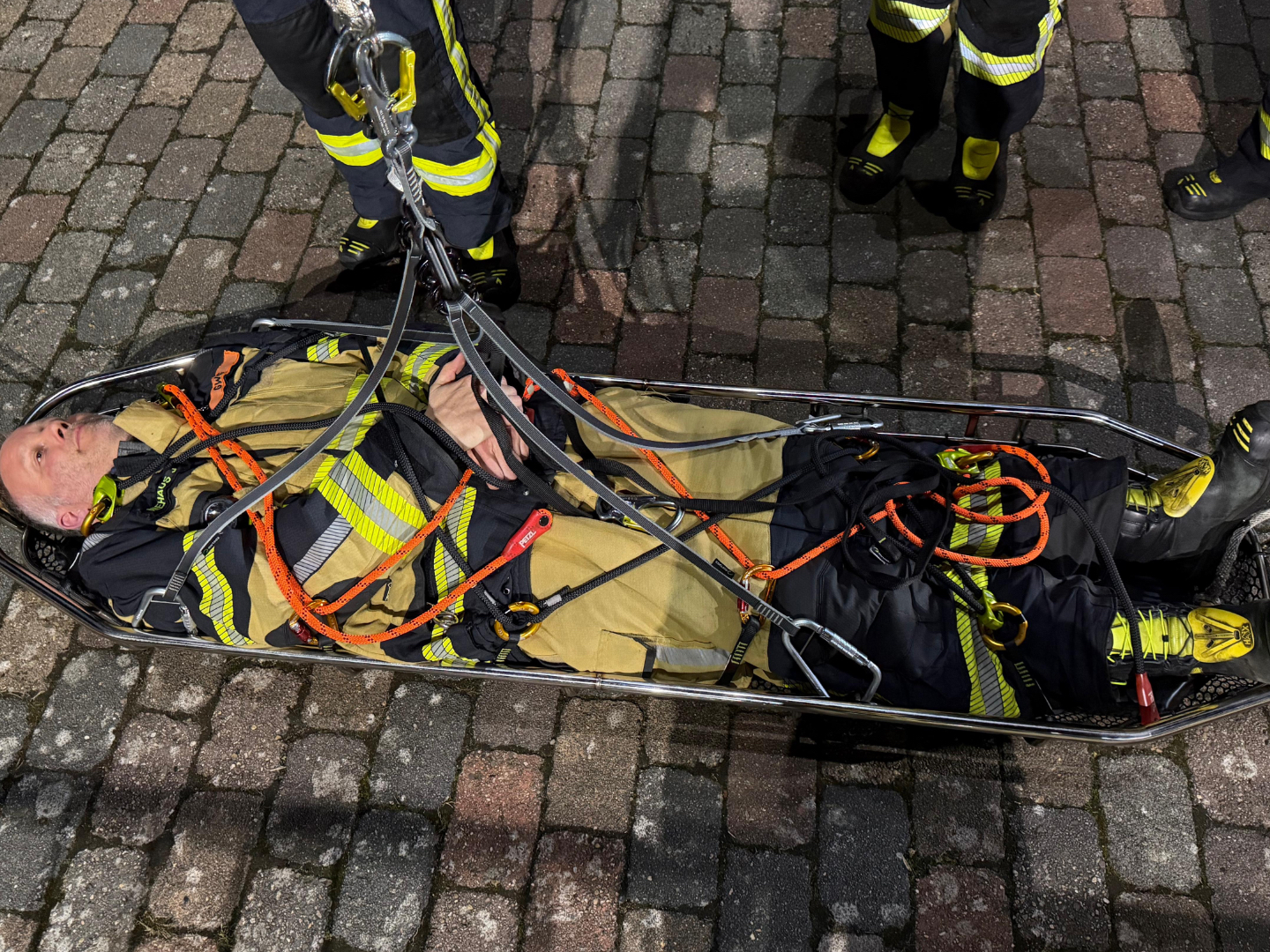 Die dritte Gruppe widmete sich dem Thema Schachtrettung. Hierbei wurde der sichere Umgang mit der Drehleiter trainiert, um Personen aus tiefer gelegenen Schächten oder ähnlichen Einsatzstellen retten zu können. Solche Einsatzlagen erfordern ein besonders koordiniertes Vorgehen sowie den sicheren Umgang mit der eingesetzten Technik.
