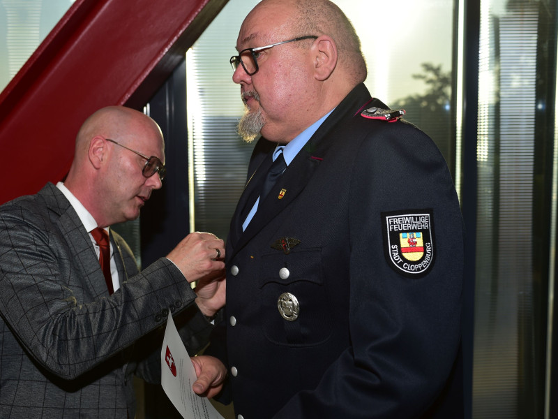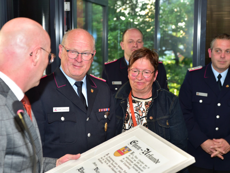 Dieter erschien in Begleitung seiner Frau Mechtild. Man konnte ihm die Rührung deutlich ansehen, als er die kunstvoll gestaltete Urkunde aus den Händen des Bürgermeisters entgegennahm. Der Applaus war anhaltend, die Glückwünsche herzlich. Dieter ist damit der zweite Ehrenbrandmeister der Feuerwehr Cloppenburg – nach Kurt Lade, dem Vater des heutigen Stadtbrandmeisters Horst Lade.