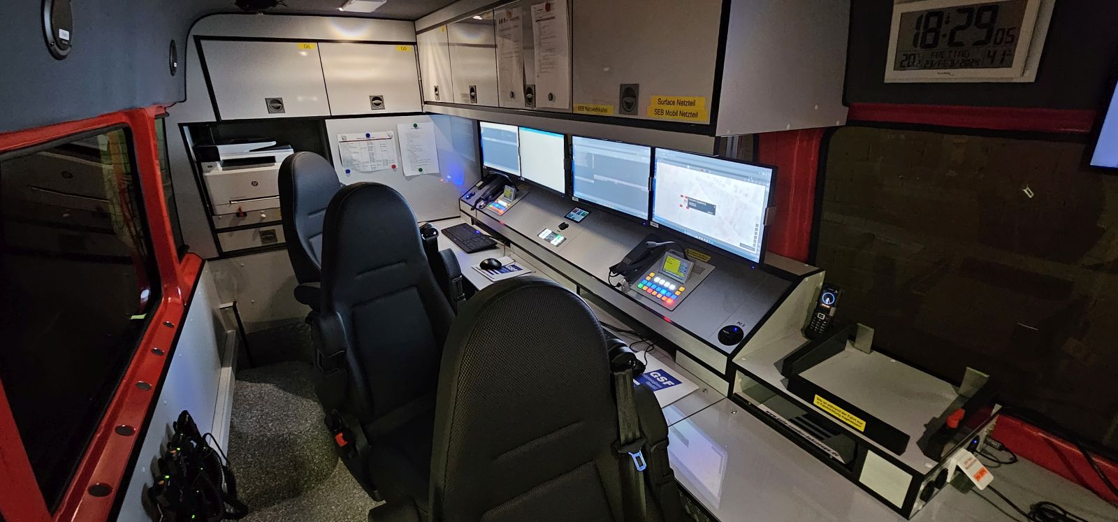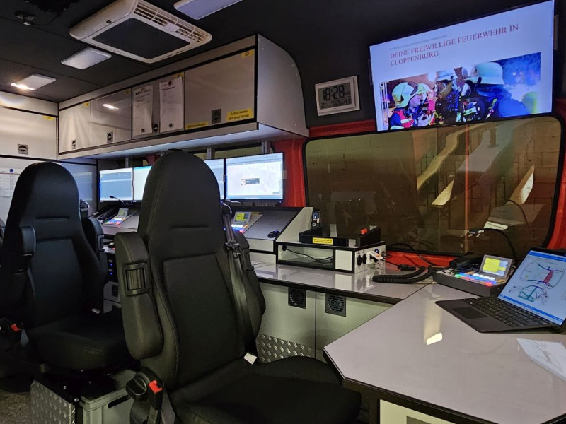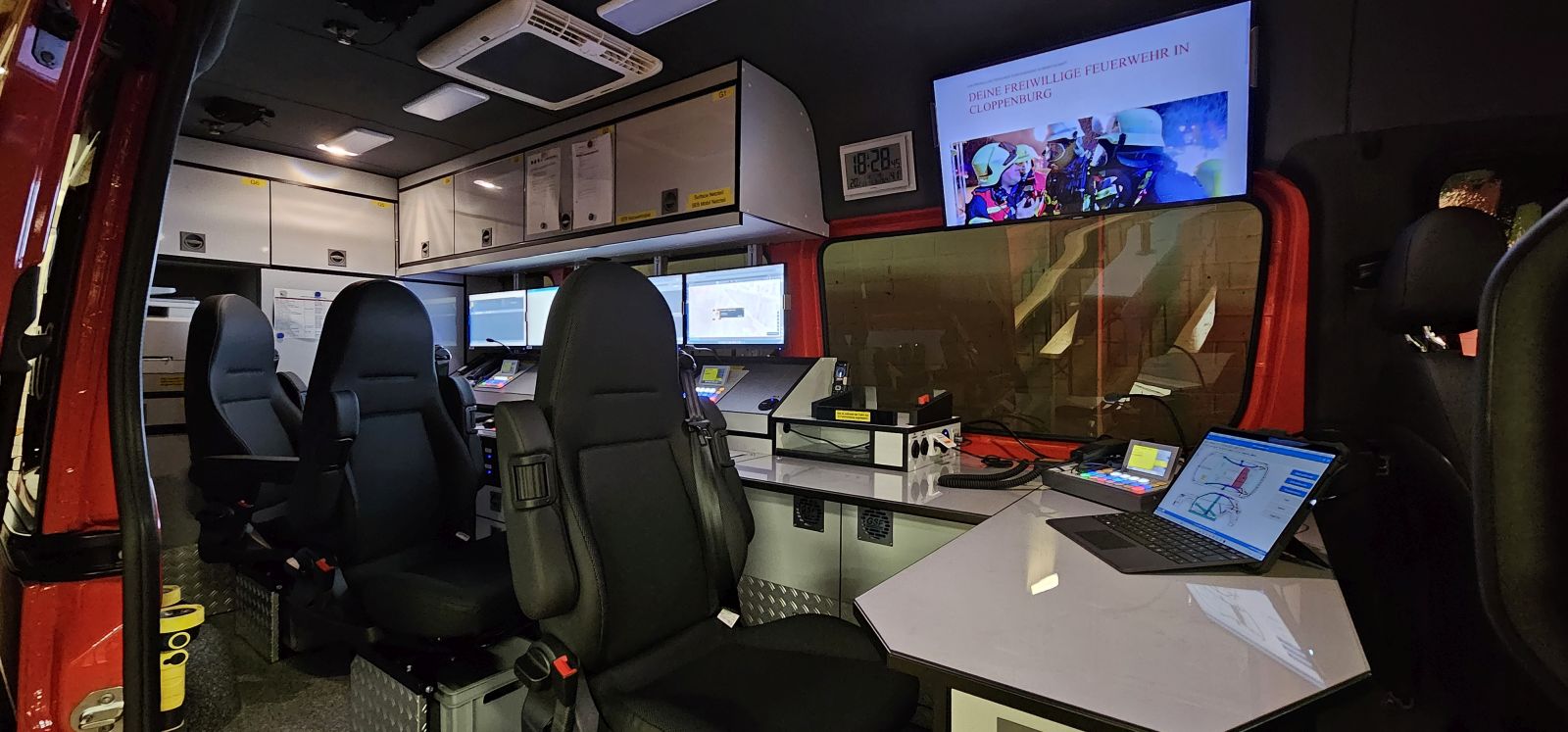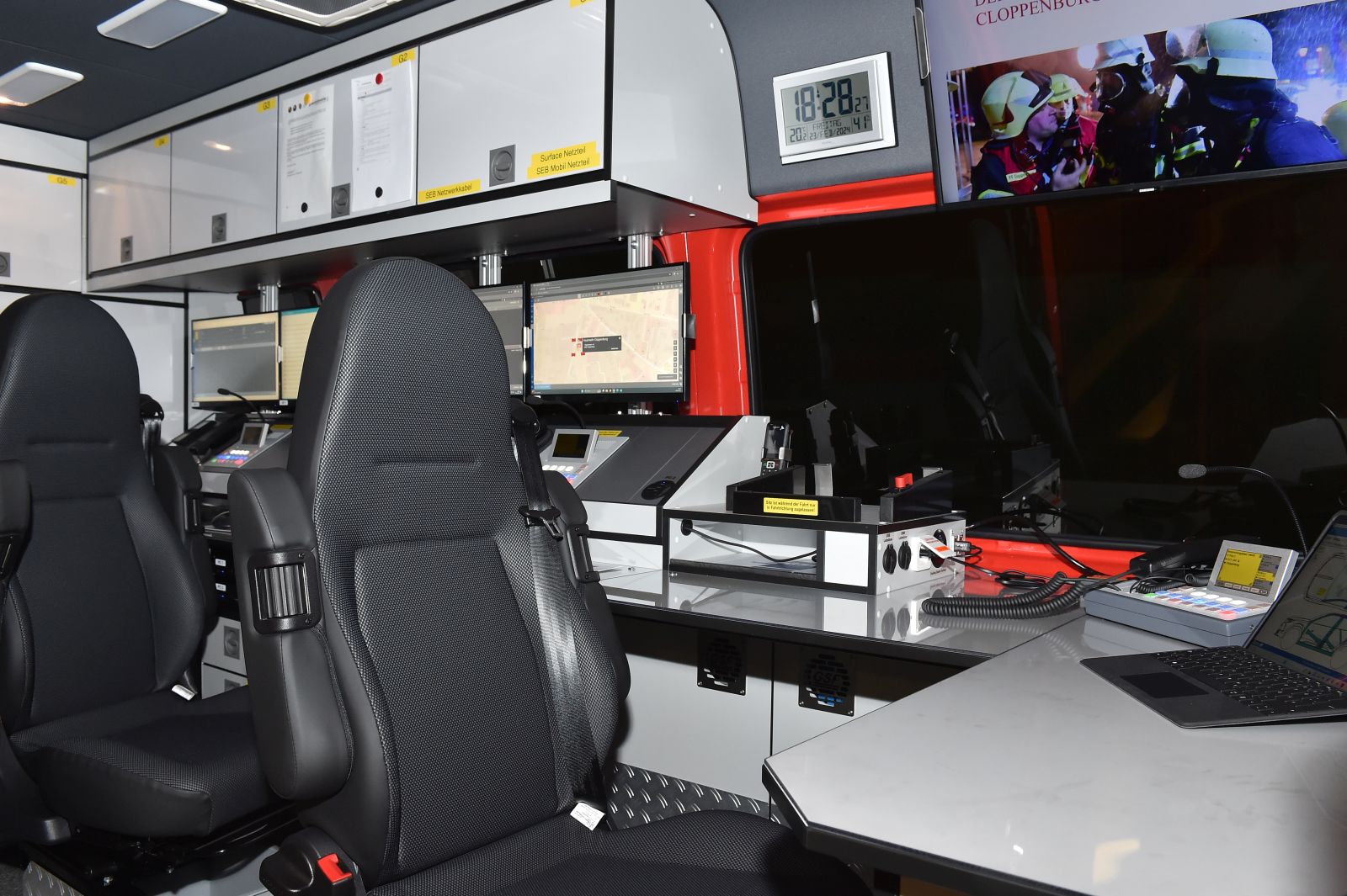 Das Fahrzeug hat 190PS und ist 5,5t schwer. Es verfügt über zwei PC Arbeitsplätzen mit jeweils zwei Bildschirmen. Von diesen können Einsätze dokumentiert und begleitet werden. Auf einem dritten Bildschirm können Informationen und Lagen bequem bereitgestellt werden. Außerdem sind fünf feste und fünf Handfunkgeräte verbaut. Ein mobiler Arbeitsplatz unterstützt bei komplexen Lagen zusätzlich. Die 5 Sitzplätze sind drehbar. Ein Funk -und Lichtmast von 6m Höhe sorgt für genug Empfang. Auch beim Mobilfunk wurde nicht gespart modernste 5G Technik unterschiedlicher Anbieter sorgt für Telefon -und Internetempfang. Das Auto kann durch eine größere Lichtmaschine und ein intelligentes Batteriemanagment auch an der Einsatzstelle ohne Fremdeinspeisung betrieben werden.
