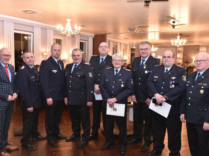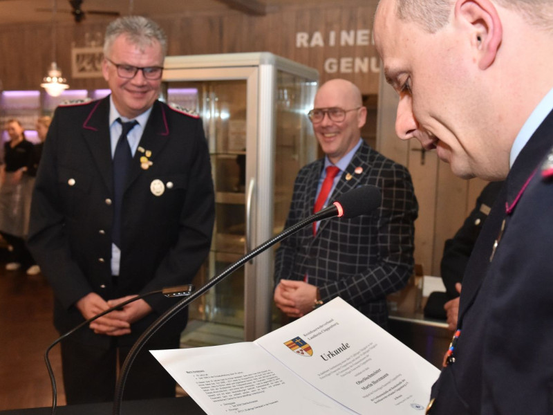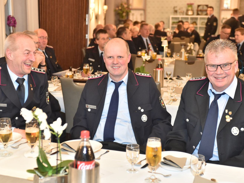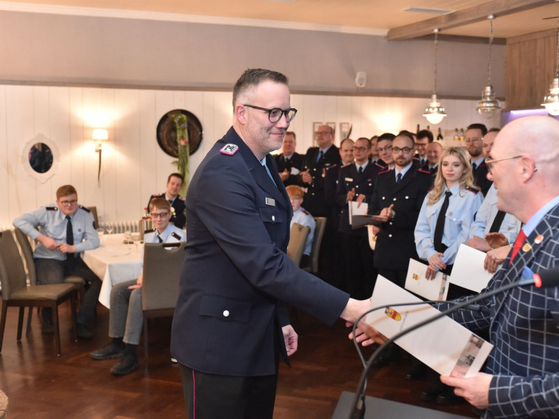 Übernahmen, Beförderungen und Ehrungen sind für unsere Generalversammlung das Salz in der Suppe. Fangen wir mit den Ehrungen an. Die kamen vom stellvertretenden Kreisbrandmeister Stefan Abshof. Die Verdienstmedaille mit Bandschnalle hatte er für Sebastian Brake, Frank Brümmer und Martin Horstmann dabei. Brake war jahrelang als Gerätewart tätig. Heute kümmert er sich als Kleiderwart um unsere Einsatzkleidung. Frank Brümmer blickt auf 28 Jahre Dienst in der Gefahrgutgruppe zurück. Und gut 10 Jahre lang war er Atemschutzgerätewart! Martin Horstmann, unser Mann für die fröhlichen Anlässe. Dreißig Jahre im Festausschuss! Ein tolles Dankeschön für drei engagierte Kameraden.