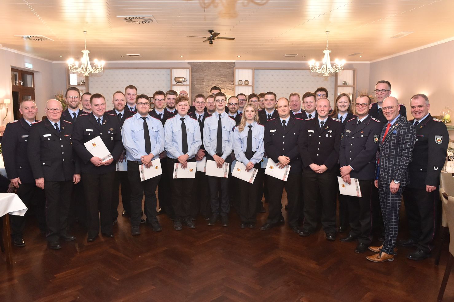 So viele Junge Leute frisch in der Wehr. Da gibt es natürlich auch unglaublich viele Sterne zu verteilen. Noch ganz ohne Stern sind die Vier, die aus der Jugendfeuerwehr in die Aktive kamen. Celina Gabriel, Michael Rauch, Falko Fenske, Tyler Laskowski. Sie haben uns schon ein paar Wochen im Dienst begleitet, jetzt sind sie auch offiziell dabei und zwar als Anwärter zum Feuerwehrmann bzw. Feuerwehrfrau.