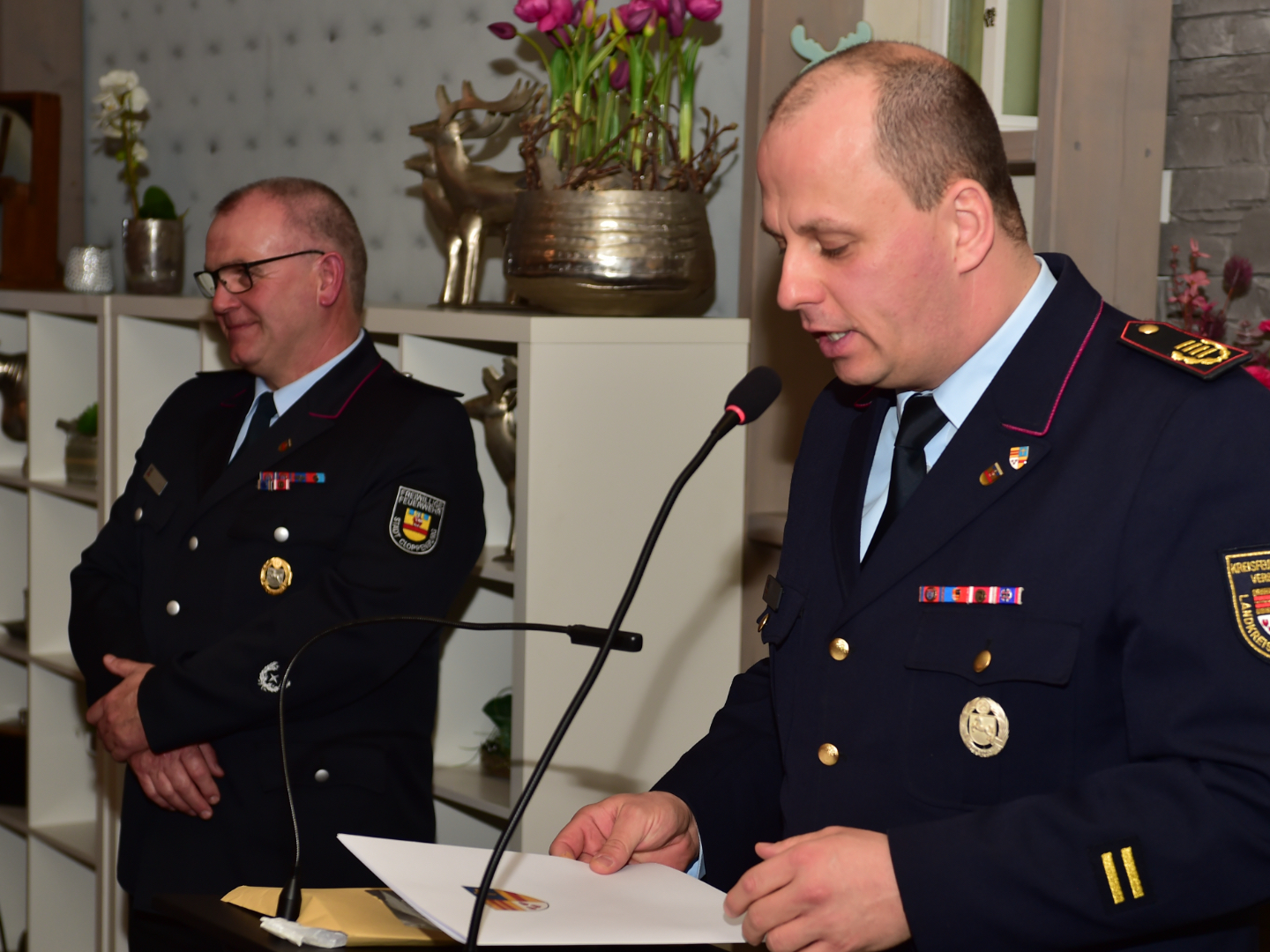 Stefan Abshof, einer aus unseren Reihen, überbrachte als stellvertretender Kreisbrandmeister die Grußworte der Kreisfeuerwehr. Und da ging sein Blick nicht nur auf das, was gerade im Landkreis läuft, sondern durchaus auch ein Stück weiter, nämlich über den Oldenburgischen Feuerwehrverband bis in Richtung Hannover. Kritisch will man sein mit Hannover, aber nicht nur um kritisch zu sein, sondern konstruktiv kritisch, also konstruktiv. Dinge klar ansprechen, ohne sie schlecht zu reden. Das wollte er deutlich machen.