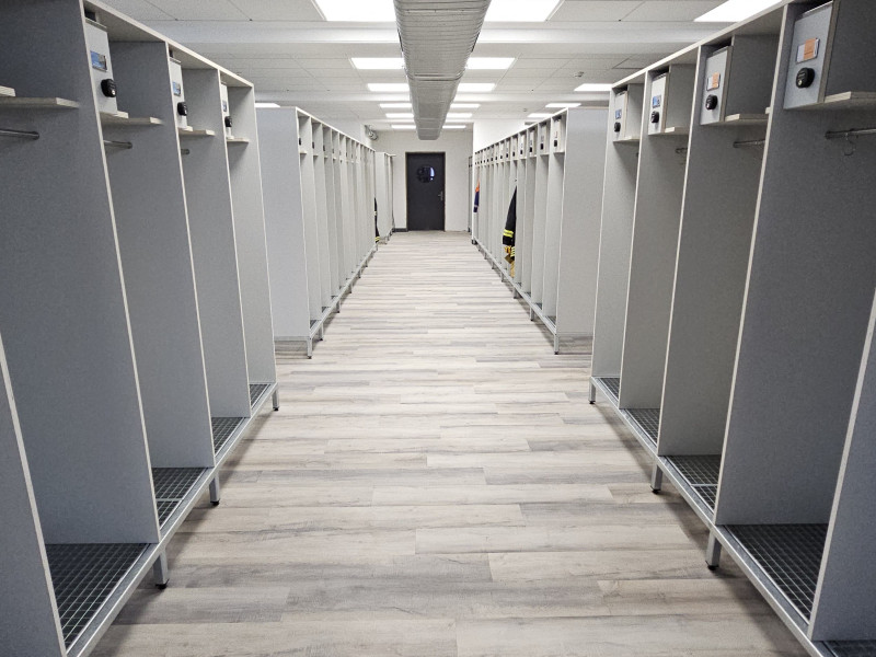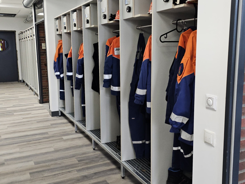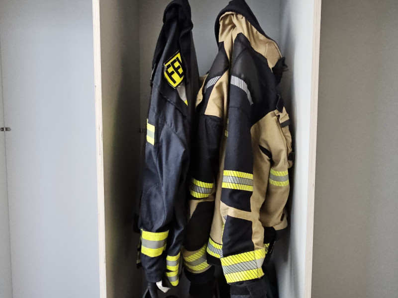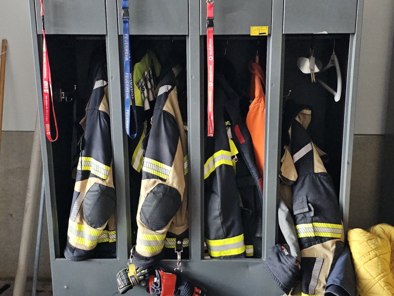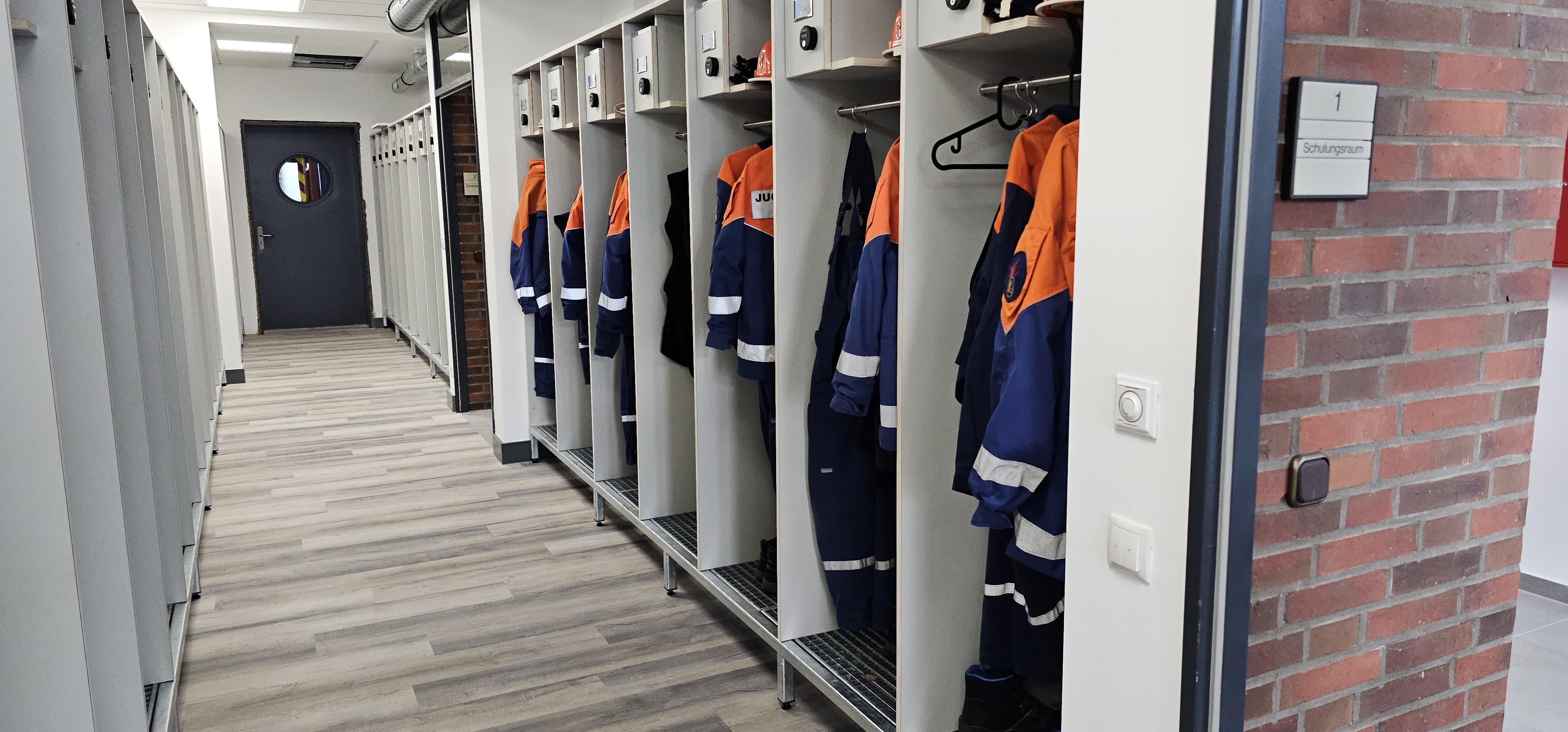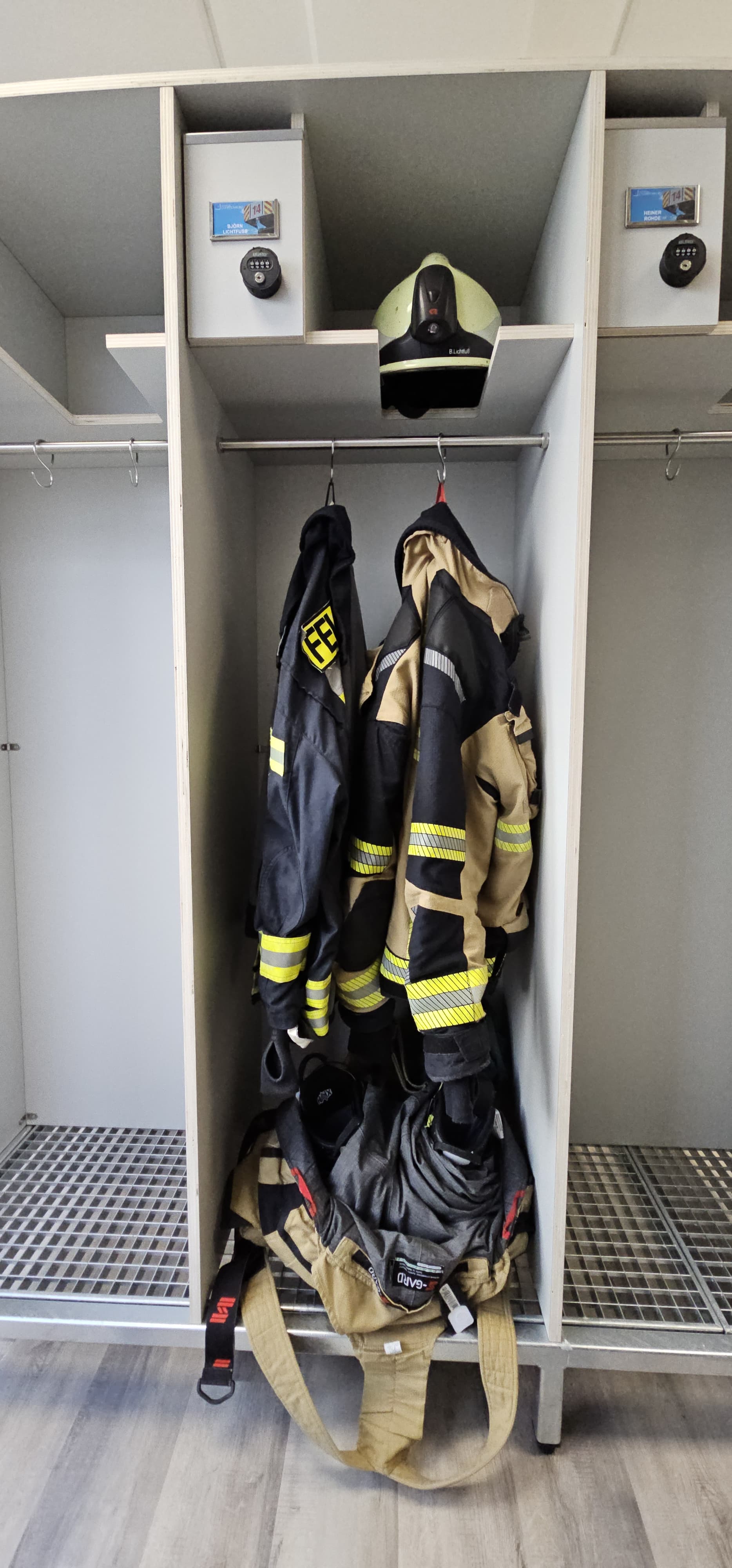 Die Umkleiden sind wirklich gut geworden. Schicke Holzeinrichtung, ausreichend breite Spinde. Jetzt müssen wir nur schauen, wie sich das in der Praxis bewährt. Ob jeder im Alarmfall sofort seinen Spind findet oder ob man sich noch ins Gehege kommt. Denn wenn der Melder geht, ist da natürlich nichts mit Ruhe – da muss es schnell gehen. Aber ich denke, das kriegen wir hin. Macht alles einen guten Eindruck. Ist schick geworden.