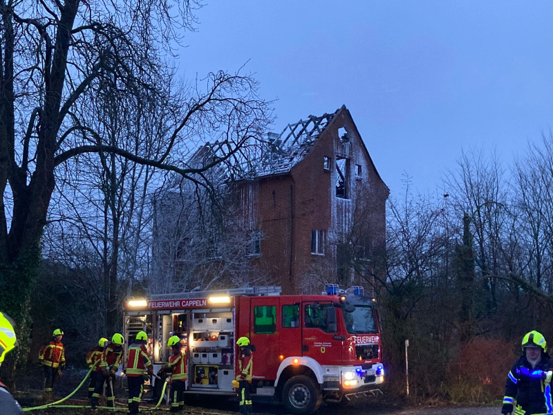 Am 06.01.2024, gegen 04:45 Uhr, geriet aus bislang unbekannter Ursache ein leerstehendes dreistöckiges Gebäude in der Cappelner Straße in 49692 Cappeln/OT Sevelten in Brand. Beim Eintreffen der Feuerwehr und der Polizei stand das ehemalige Wirtschaftsgebäude bereits in Vollbrand und Flammen schlugen aus dem Dach aus. Für die Dauer der Löscharbeiten musste die Cappelner Straße in Bereich des Brandortes voll gesperrt und der Verkehr abgeleitet werden. Die örtliche Feuerwehr Cappeln, Elsten, Schwichteler und Cloppenburg war mit insgesamt zehn Fahrzeugen vor Ort und konnte den Brand löschen. Es entstand ein geschätzter Sachschaden in Höhe von 50.000 Euro. Der Brandort wurde seitens der Polizei Cloppenburg beschlagnahmt. Die Ermittlungen zur Brandursache dauern an.
