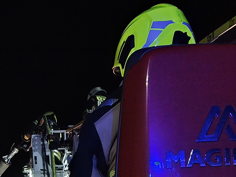 Zweimal hat es in den vergangenen Jahren in der ehemaligen Raststätte Cloppenburger Land gebrannt. In der Nacht auf Samstag brannte es dann zum dritten Mal. Jetzt war es die Kegelbahn. Als wir gegen 00:45 eintrafen schlugen Flammen aus dem vorgebauten Gastraum. An einen Löscheinsatz im Inneren des Gebäudes war nicht denken. Zu groß wäre die Gefahr für unsere Atemschutztrupps gewesen. Also löschten wir von außen mit dem Strahlrohr und über den Wasserwerfer der Drehleiter. Das Flachdach der Kegelbahn stellte ein Problem dar. Wir schufen uns zunächst eine Öffnung im Mauerwerk um auch in der Bahn löschen zu können. Dabei kamen eher selten genutzte Werkzeuge wie der benzingetriebene Trennschneider zum Einsatz. Später stand uns ein Bagger zur Verfügung. Zunächst von einem technischen Betrieb in der Nachbarschaft, dann vom städtischen Bauhof. Als das Dach entfernt war, flammte es noch einmal gut auf, das bekamen wir aber schnell in den Griff.