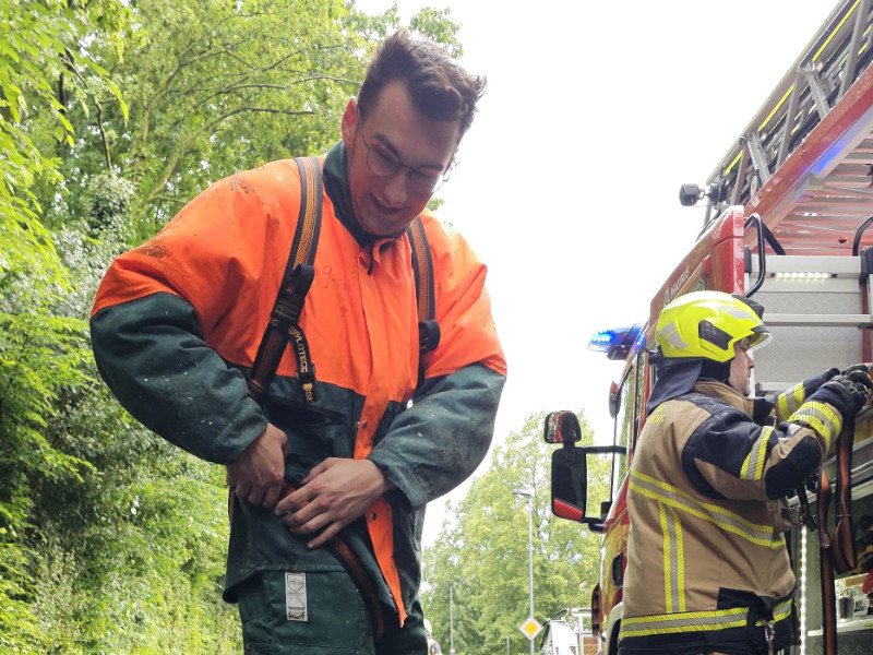 Wir zerlegten das Bruchstück in handhabbare Teile und lagerten diese gesichert am Straßenrand. Anschließend wurde die Drehleiter in Stellung gebracht, um den betroffenen Baum weiter auf mögliche Gefahrenstellen zu prüfen. Lose Reste in der Krone wurden entfernt, um eine Gefährdung für den Straßenverkehr auszuschließen.