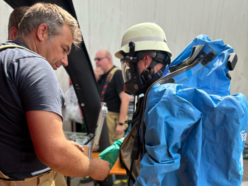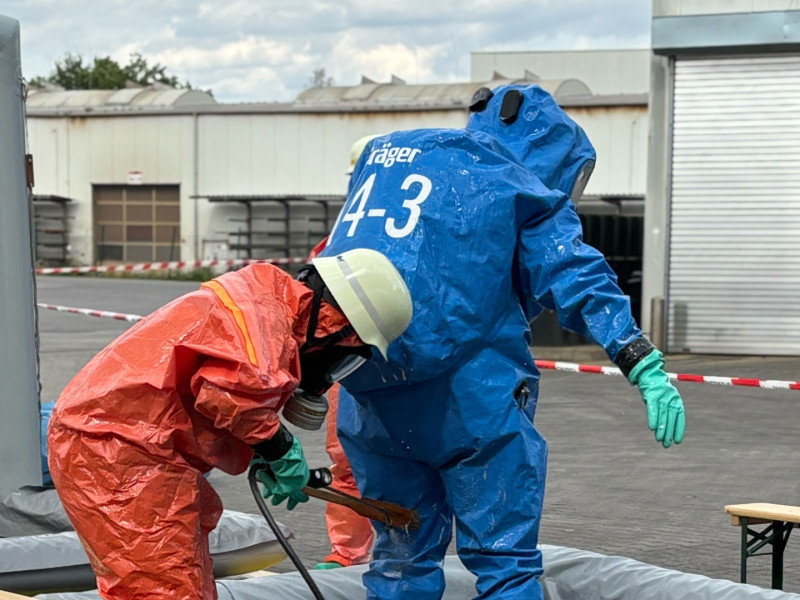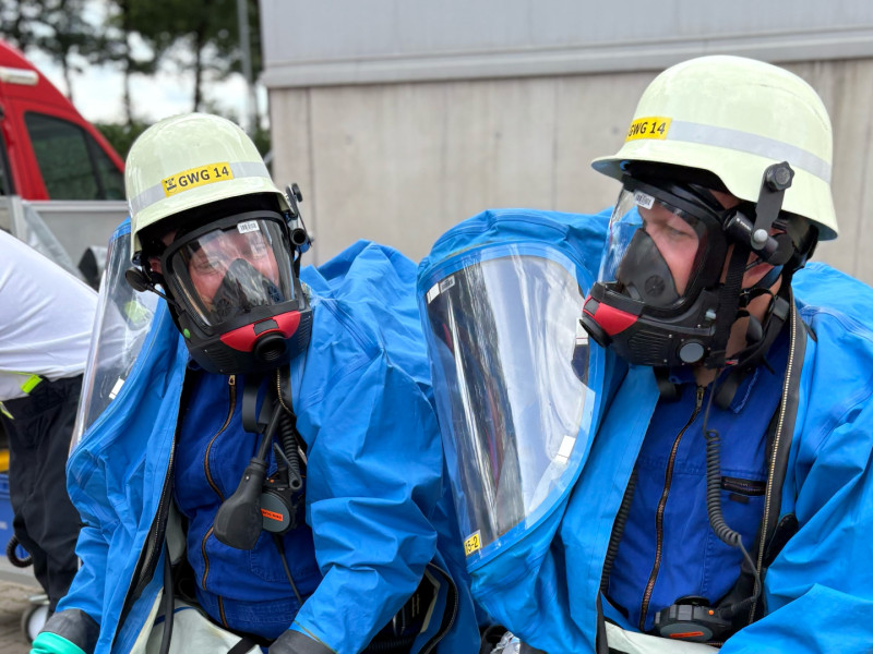 Nach der ersten Lageerkundung durch die Führungskräfte wurden folgende Aufgaben unter schwerem Atemschutz sowie in Chemikalienschutzanzügen (CSA) abgearbeitet: Zunächst musste der Domdeckel des betroffenen Behälters geöffnet werden, um den genauen Ort der Reaktion zu lokalisieren. Anschließend wurden Temperaturmessungen durchgeführt und der Gefahrstoff bestimmt.