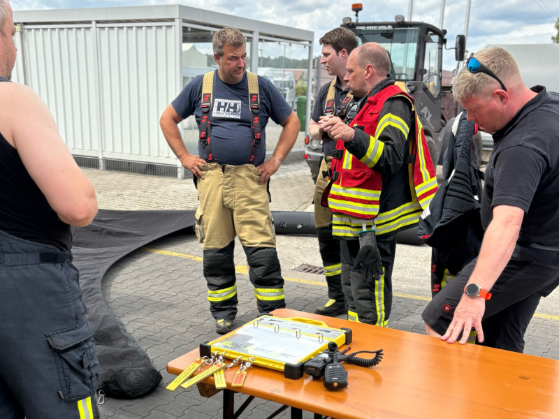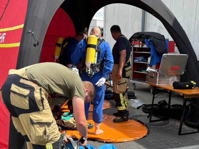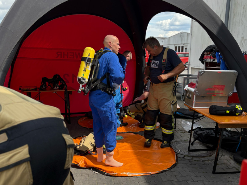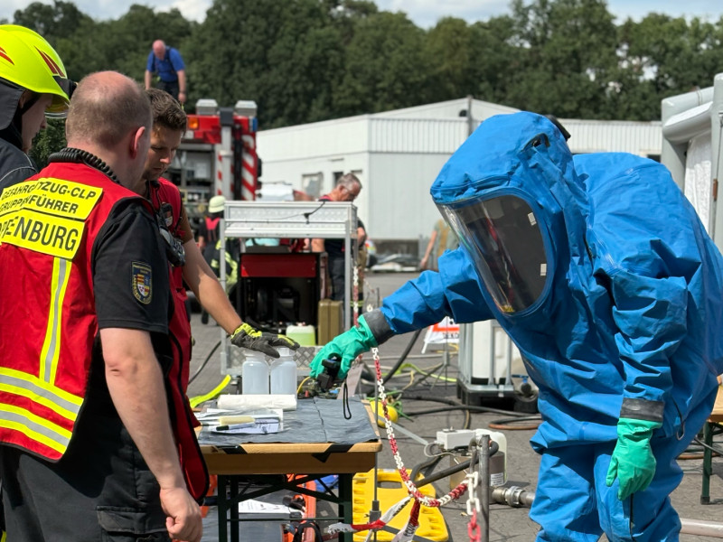 Nach Abschluss der Arbeiten mussten die eingesetzten Angriffstrupps die Dekontaminationsstrecke durchlaufen und gründlich gereinigt werden. Die Feuerwehr Cloppenburg stellte insgesamt zwei Trupps, die unter schwierigen Bedingungen im Einsatz waren.
