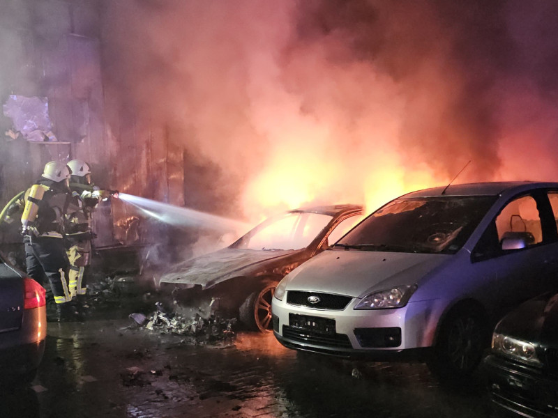 In der Nacht auf Montag wurden wir gegen 00:40 Uhr zu einem Feuer auf dem Gelände einer Kfz-Werkstatt in der Sevelter Straße alarmiert. Mehrere Fahrzeuge brannten in voller Ausdehnung. Die Flammen hatten bereits auf die Gebäudefassade übergegriffen.