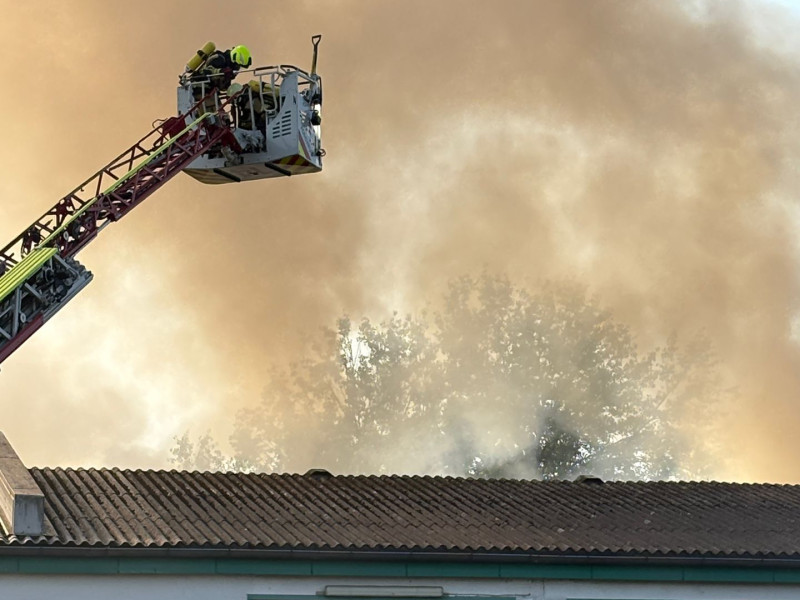 Brand einer Halle – Unterstützung mit Drehleiter
