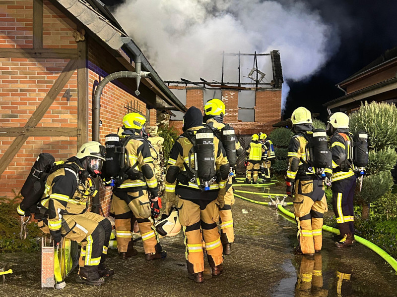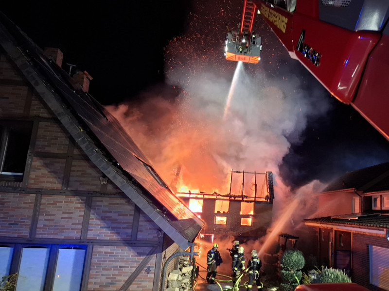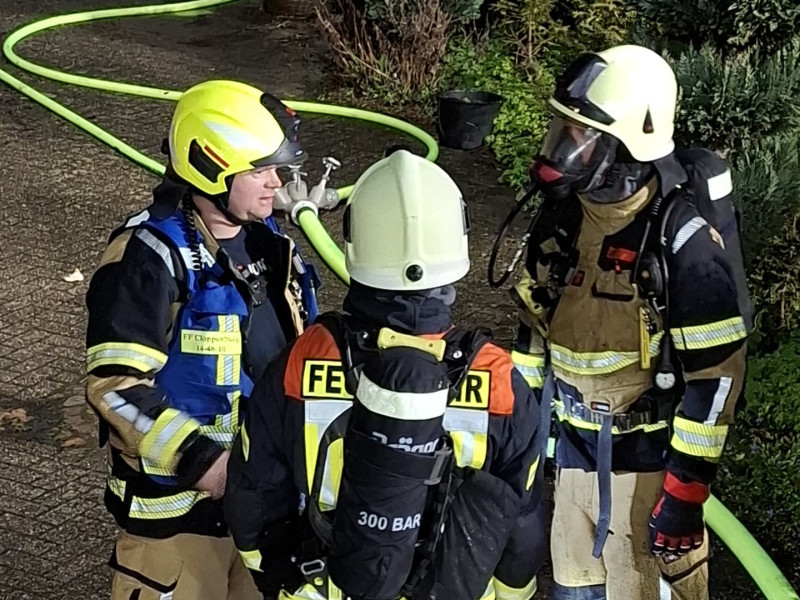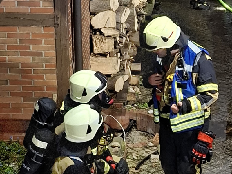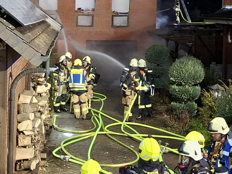 Um eine weitere Ausbreitung auf das direkt angrenzende Wohnhaus zu verhindern, wurde umgehend ein massiver Löschangriff eingeleitet. Zahlreiche Trupps unter schwerem Atemschutz gingen im Außenangriff gegen die Flammen vor. Ein besonderer Fokus lag dabei auf der Riegelstellung zum Hauptgebäude. Durch den schnellen und gezielten Einsatz konnte ein Übergreifen des Feuers auf das Wohnhaus erfolgreich verhindert werden.