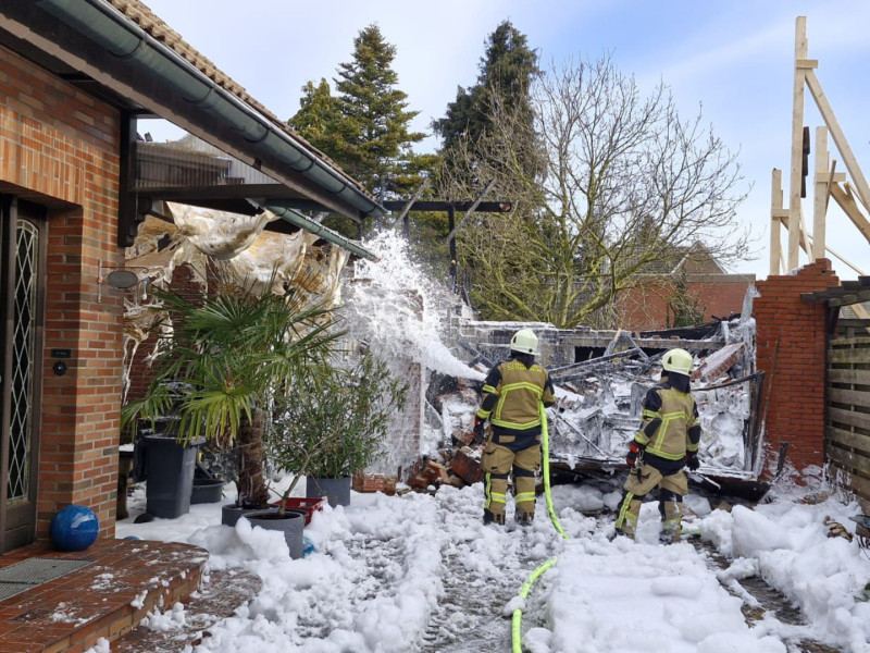 Um eine nachhaltige Löschwirkung zu erzielen und tiefsitzende Glutnester im Bereich des PKW und der Dachkonstruktion sicher abzudecken, setzten die Einsatzkräfte im Verlauf der Löscharbeiten auch Schaum als Netzmittel ein.