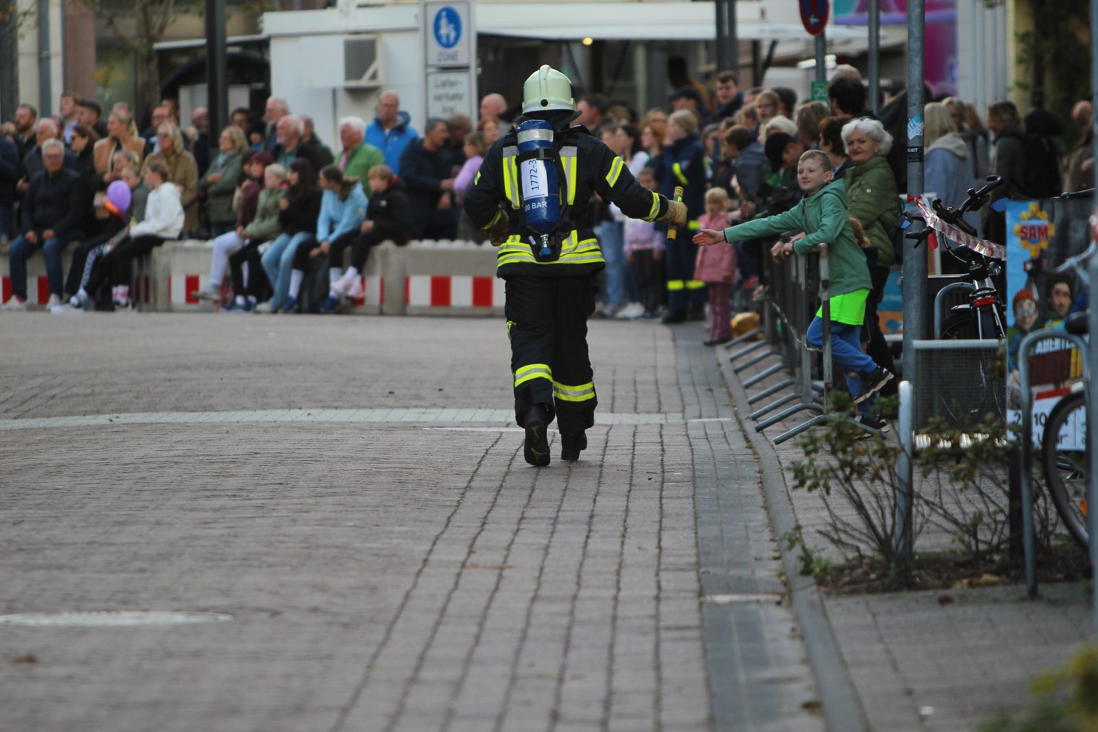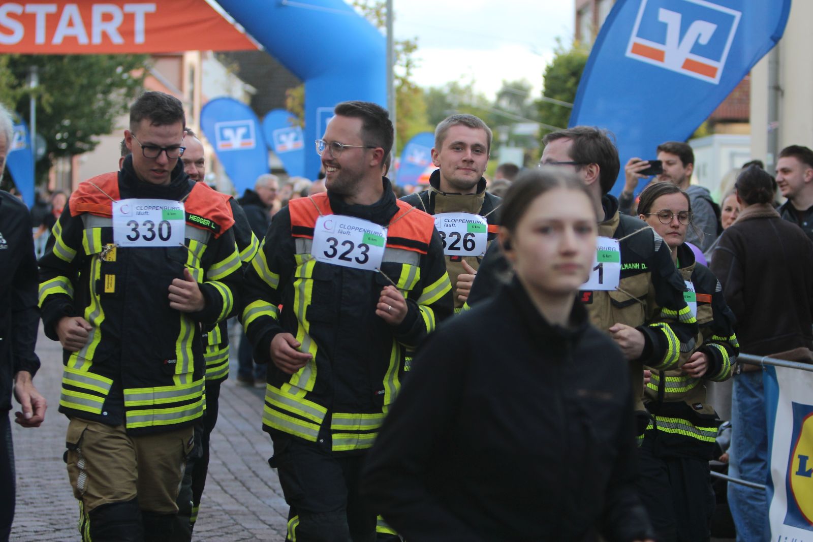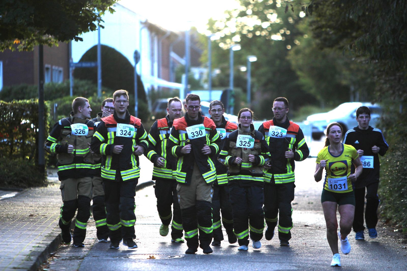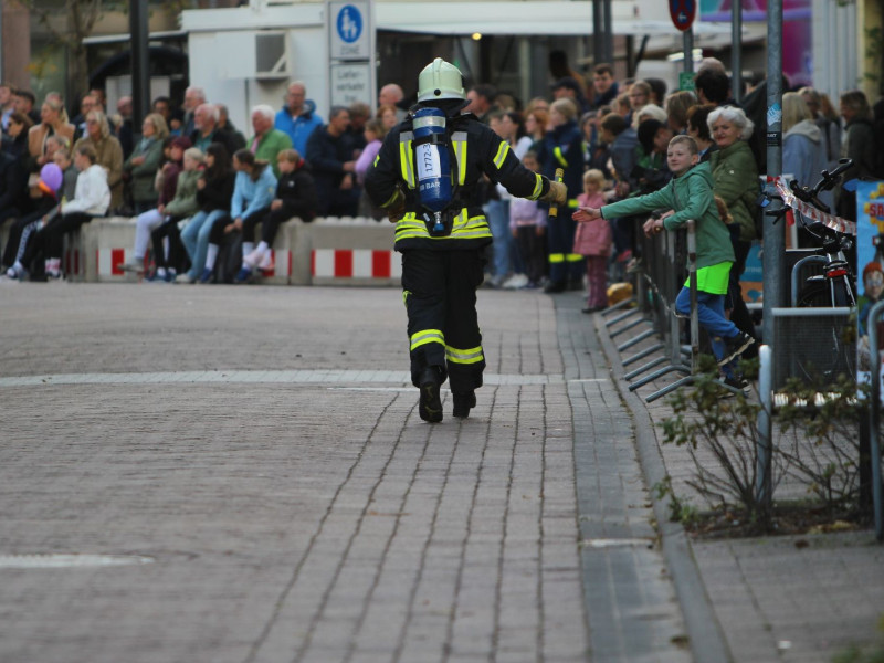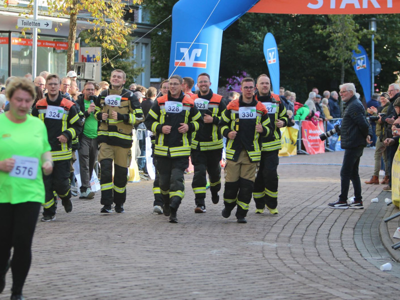 Gegen 17 Uhr ging es für die nächste achtköpfige Gruppe weiter. Hier galt es, den 6-Kilometer-Lauf in Einsatzbekleidung und Laufschuhen zu absolvieren. Auch hier waren die Zuschauer begeistert. Über den großen Streckenverlauf blieb die Gruppe immer zusammen und lief ins Ziel ein.