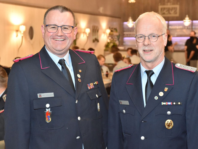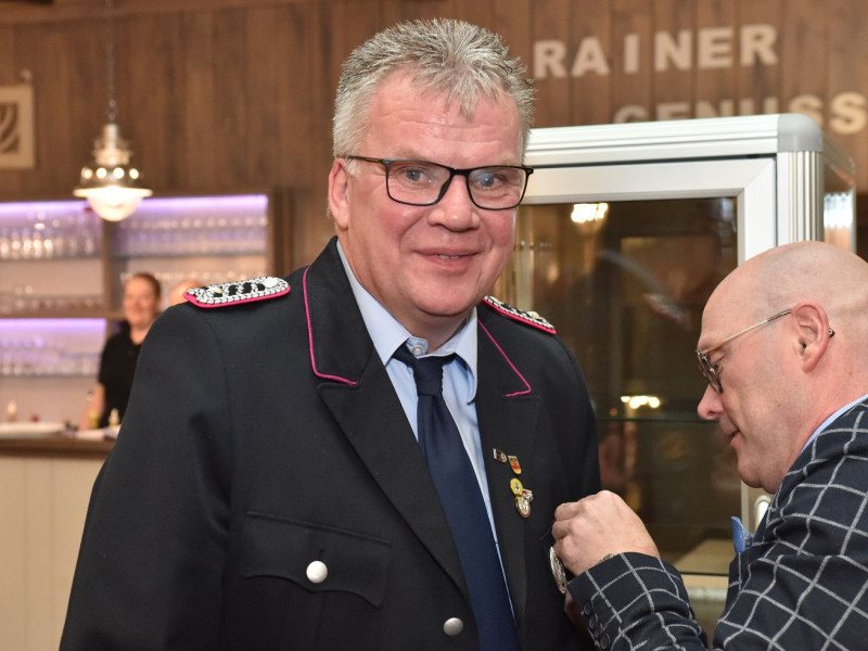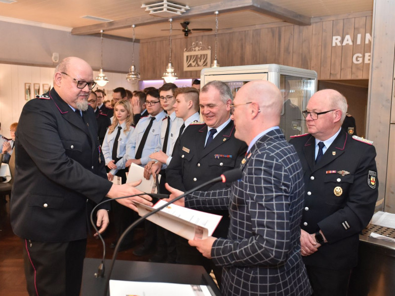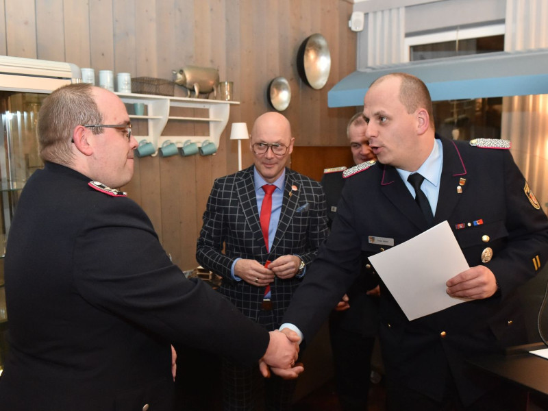 Übernahmen, Beförderungen und Ehrungen sind für unsere Generalversammlung das Salz in der Suppe. Fangen wir mit den Ehrungen an. Die kamen vom stellvertretenden Kreisbrandmeister Stefan Abshof. Die Verdienstmedaille mit Bandschnalle hatte er für Sebastian Brake, Frank Brümmer und Martin Horstmann dabei. Brake war jahrelang als Gerätewart tätig. Heute kümmert er sich als Kleiderwart um unsere Einsatzkleidung. Frank Brümmer blickt auf 28 Jahre Dienst in der Gefahrgutgruppe zurück. Und gut 10 Jahre lang war er Atemschutzgerätewart! Martin Horstmann, unser Mann für die fröhlichen Anlässe. Dreißig Jahre im Festausschuss! Ein tolles Dankeschön für drei engagierte Kameraden.