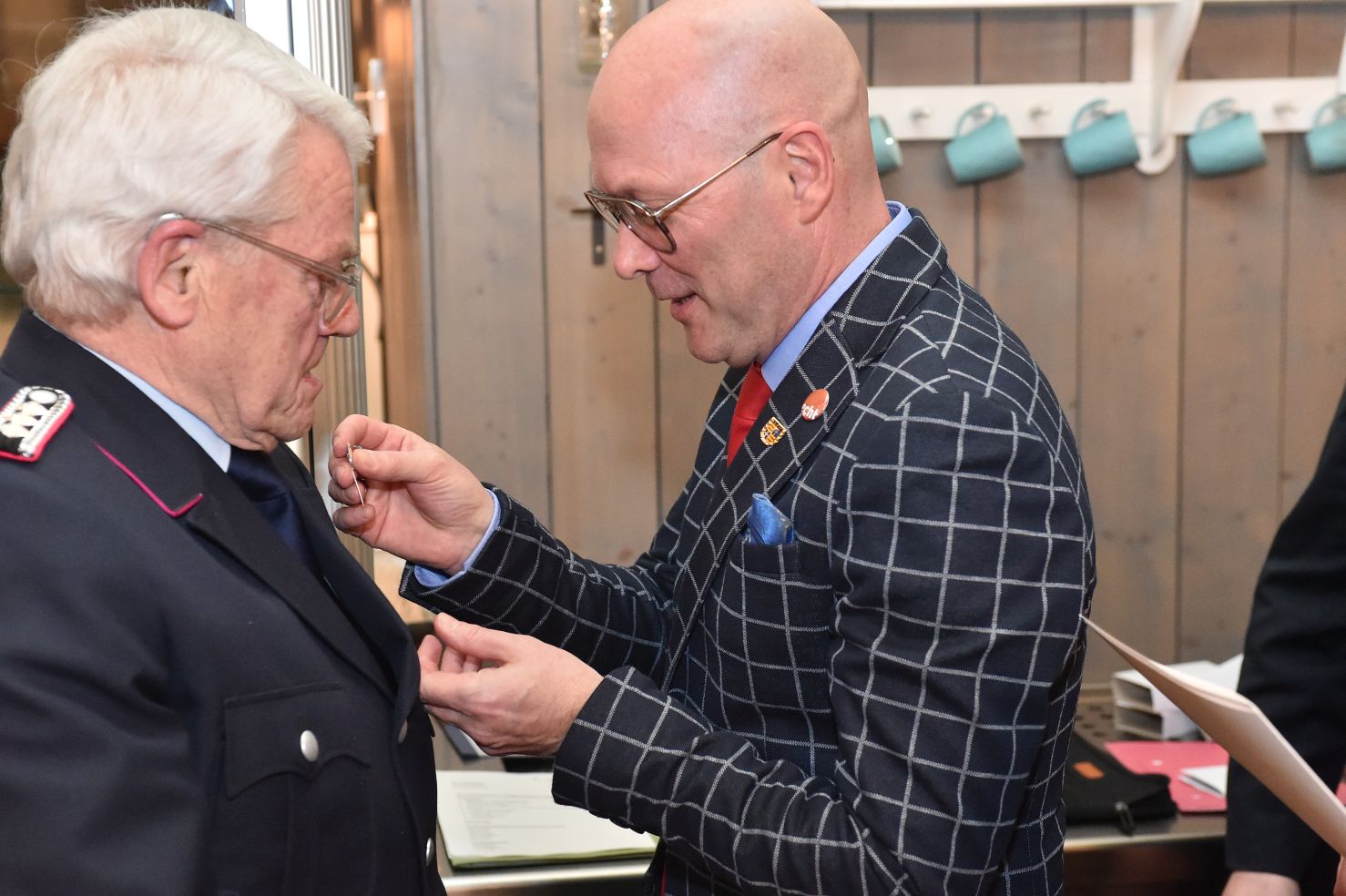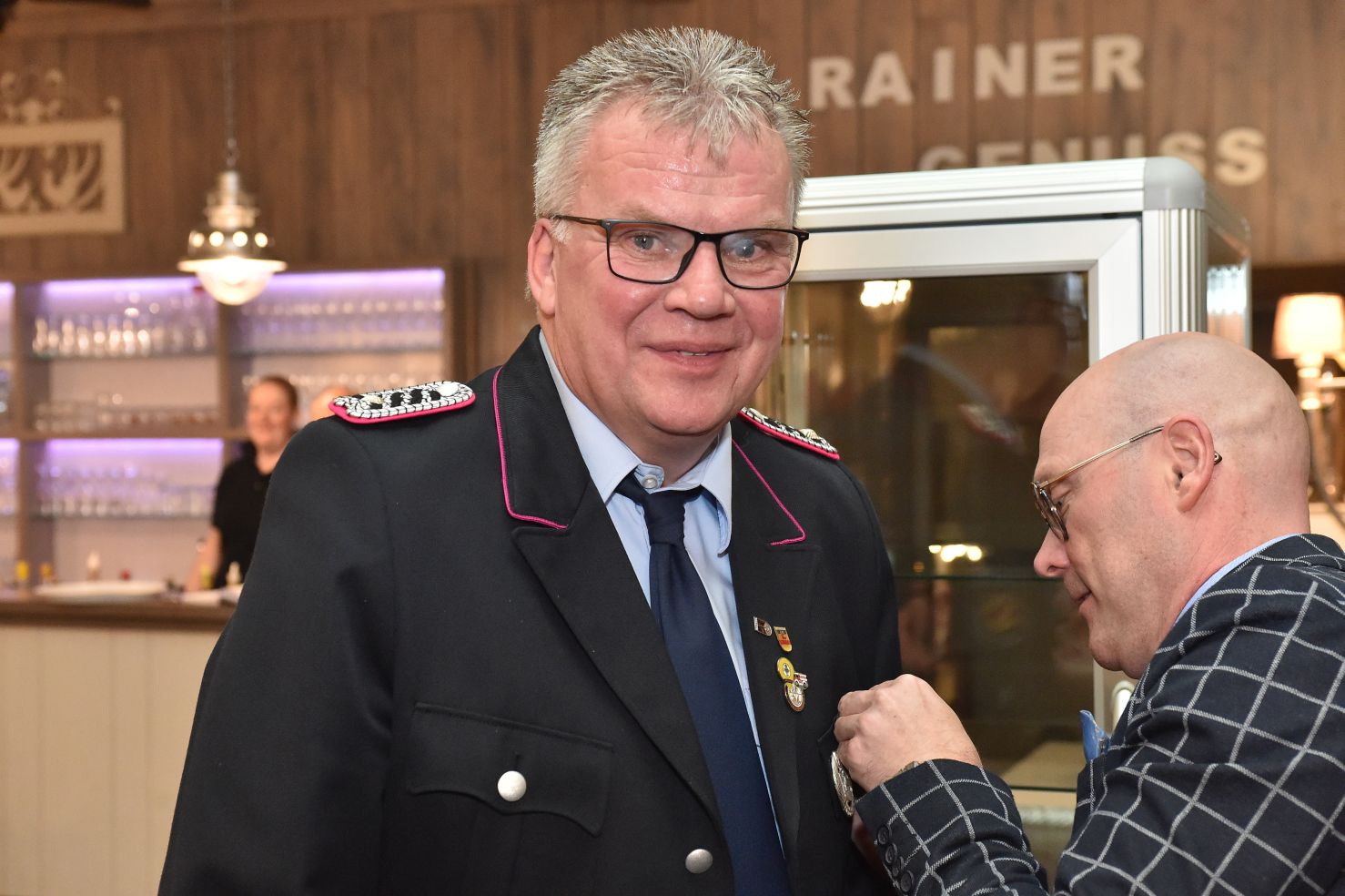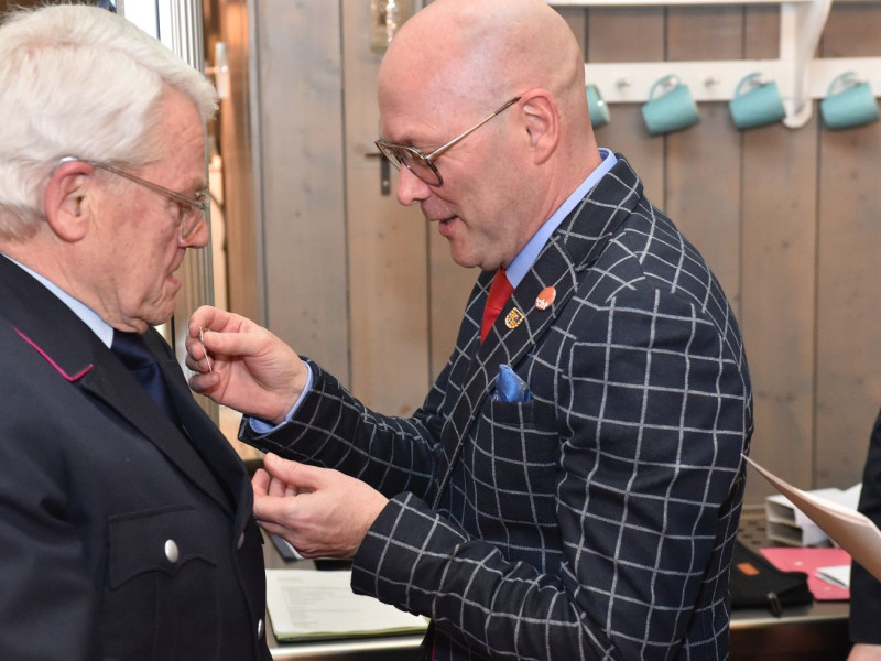 Dann gab es noch Silber. Nach 17 Jahren im Amt… Richtig, hier geht es wieder um Toto Imsiecke. Also, 17 Jahre Präsident der Altersabteilung, da kann man schon mal die silberne Ehrennadel des Oldenburgischen Feuerwehrverbandes raushauen!