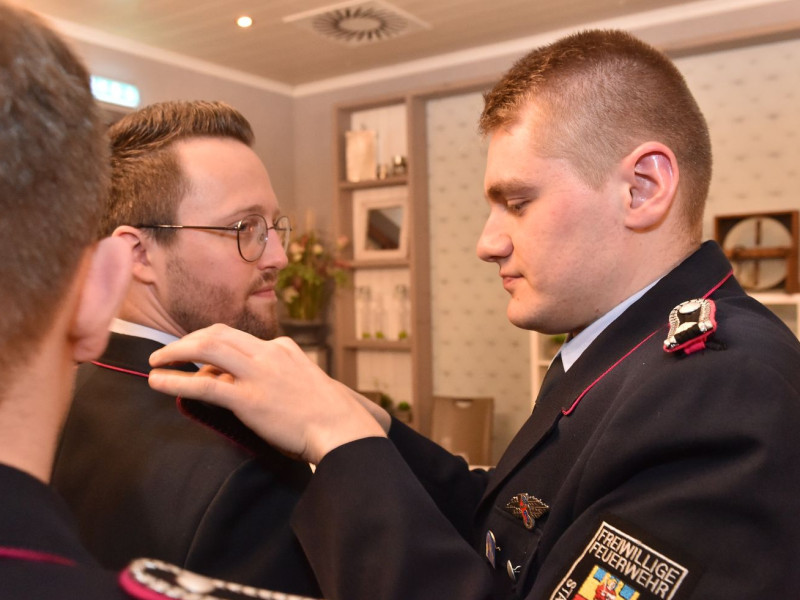 So viele Junge Leute frisch in der Wehr. Da gibt es natürlich auch unglaublich viele Sterne zu verteilen. Noch ganz ohne Stern sind die Vier, die aus der Jugendfeuerwehr in die Aktive kamen. Celina Gabriel, Michael Rauch, Falko Fenske, Tyler Laskowski. Sie haben uns schon ein paar Wochen im Dienst begleitet, jetzt sind sie auch offiziell dabei und zwar als Anwärter zum Feuerwehrmann bzw. Feuerwehrfrau.