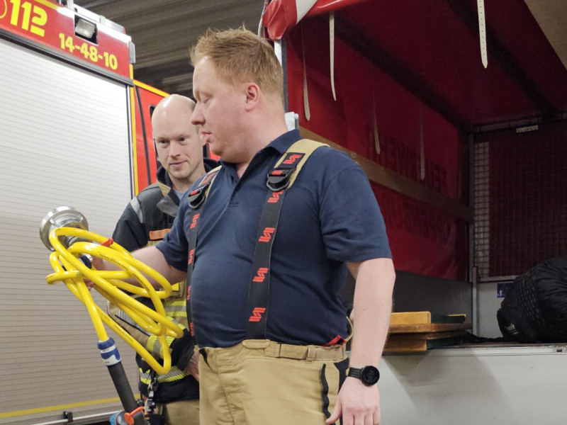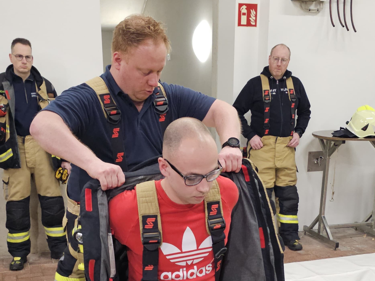 Wichtig ist, das Atemschutzgerät bleibt möglichst lange auf. Oder, falls die Flaschen leer sind, wird durch einen leichten Schwebstofffilter ersetzt. Damit sich beim Ankleiden niemand zusätzlich mit Ruß und Giftstoffen belastet. Verschmutzte Hautpartien werden mit speziellen Tüchern oder einer Waschemulsion gereinigt. Danach folgt das Ankleiden. Ein Jogginganzug und gereinigte Stiefel sorgen dafür, dass niemand friert oder in Unterwäsche über die Einsatzstelle laufen muss.