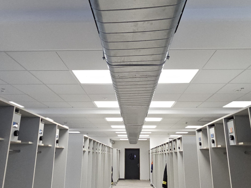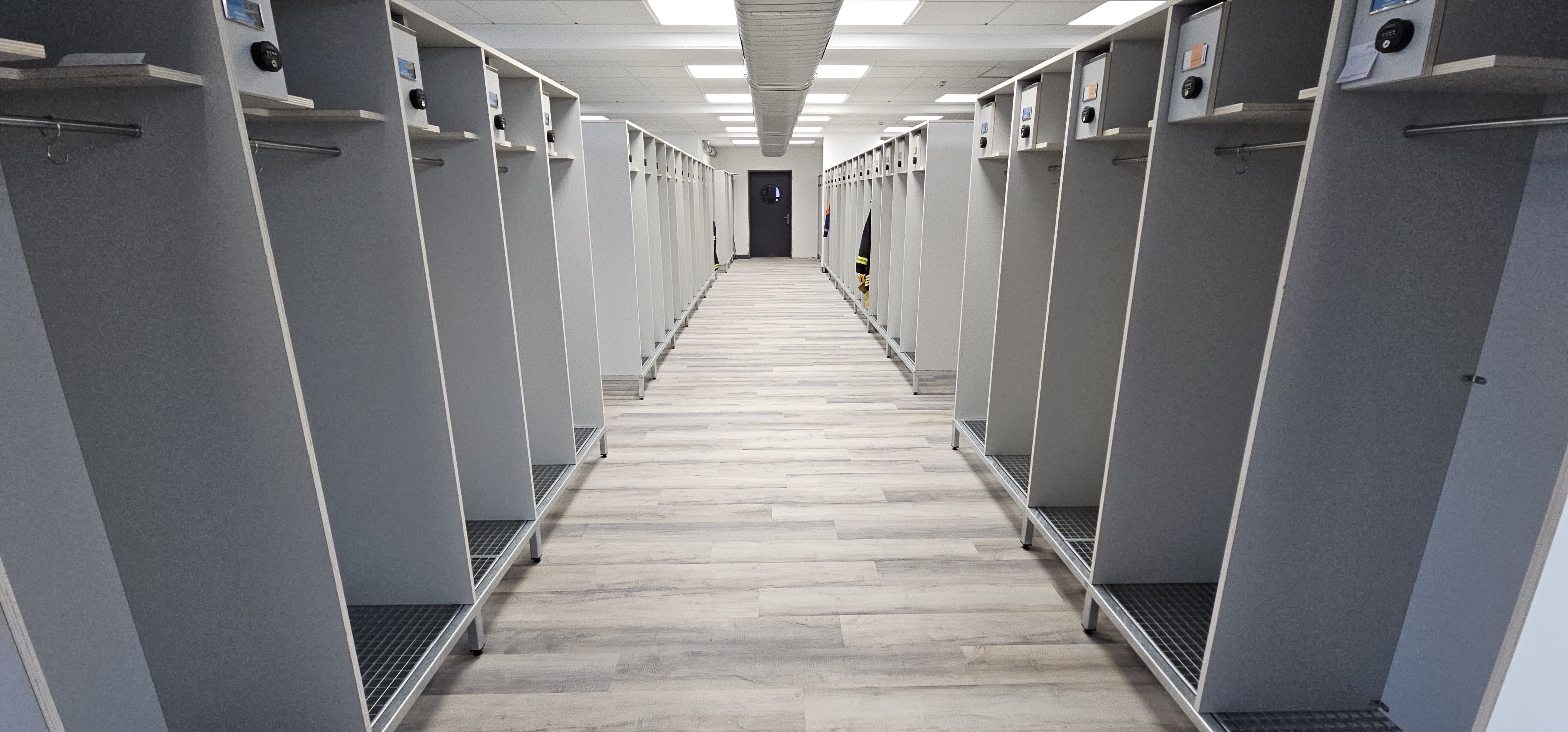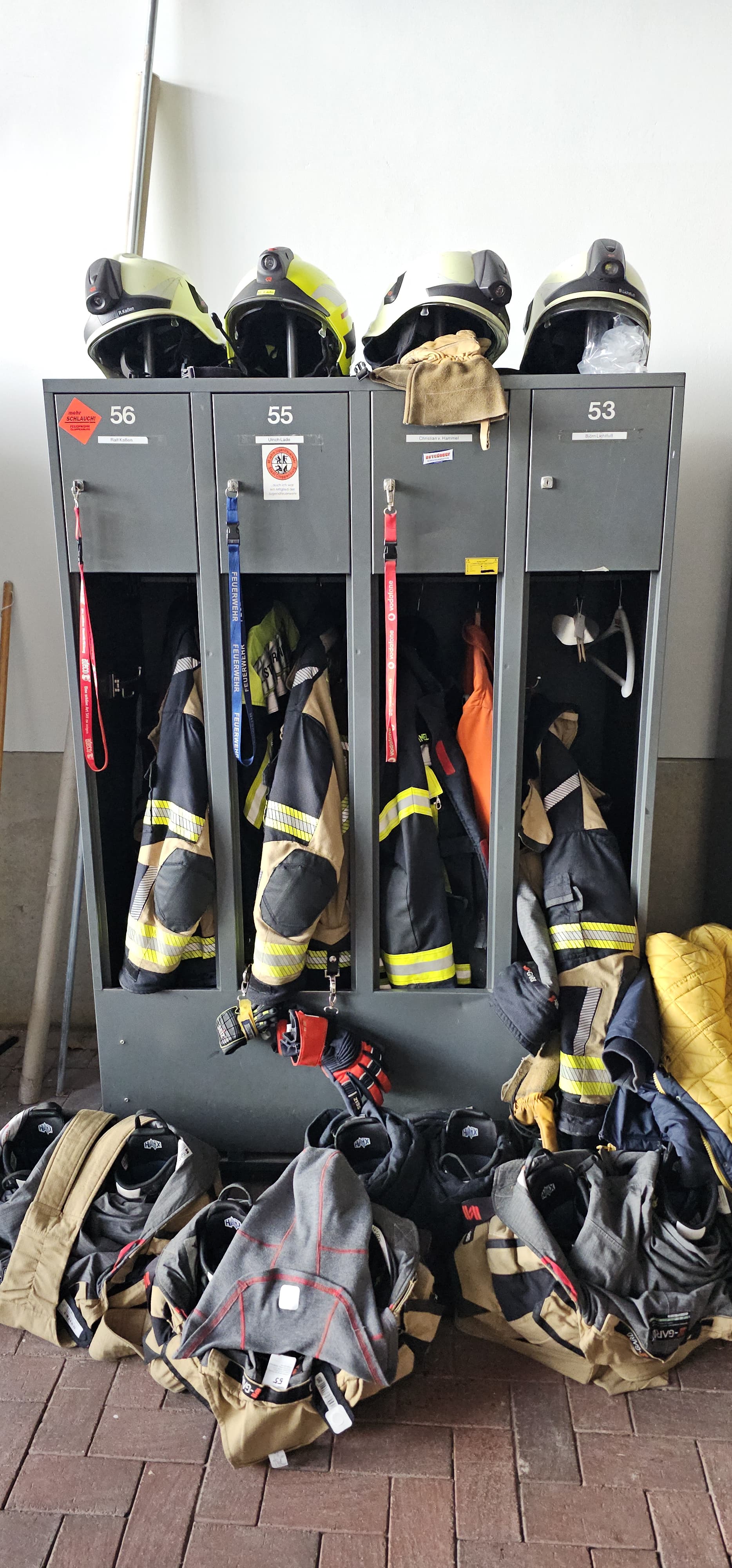 Die Umkleiden sind wirklich gut geworden. Schicke Holzeinrichtung, ausreichend breite Spinde. Jetzt müssen wir nur schauen, wie sich das in der Praxis bewährt. Ob jeder im Alarmfall sofort seinen Spind findet oder ob man sich noch ins Gehege kommt. Denn wenn der Melder geht, ist da natürlich nichts mit Ruhe – da muss es schnell gehen. Aber ich denke, das kriegen wir hin. Macht alles einen guten Eindruck. Ist schick geworden.